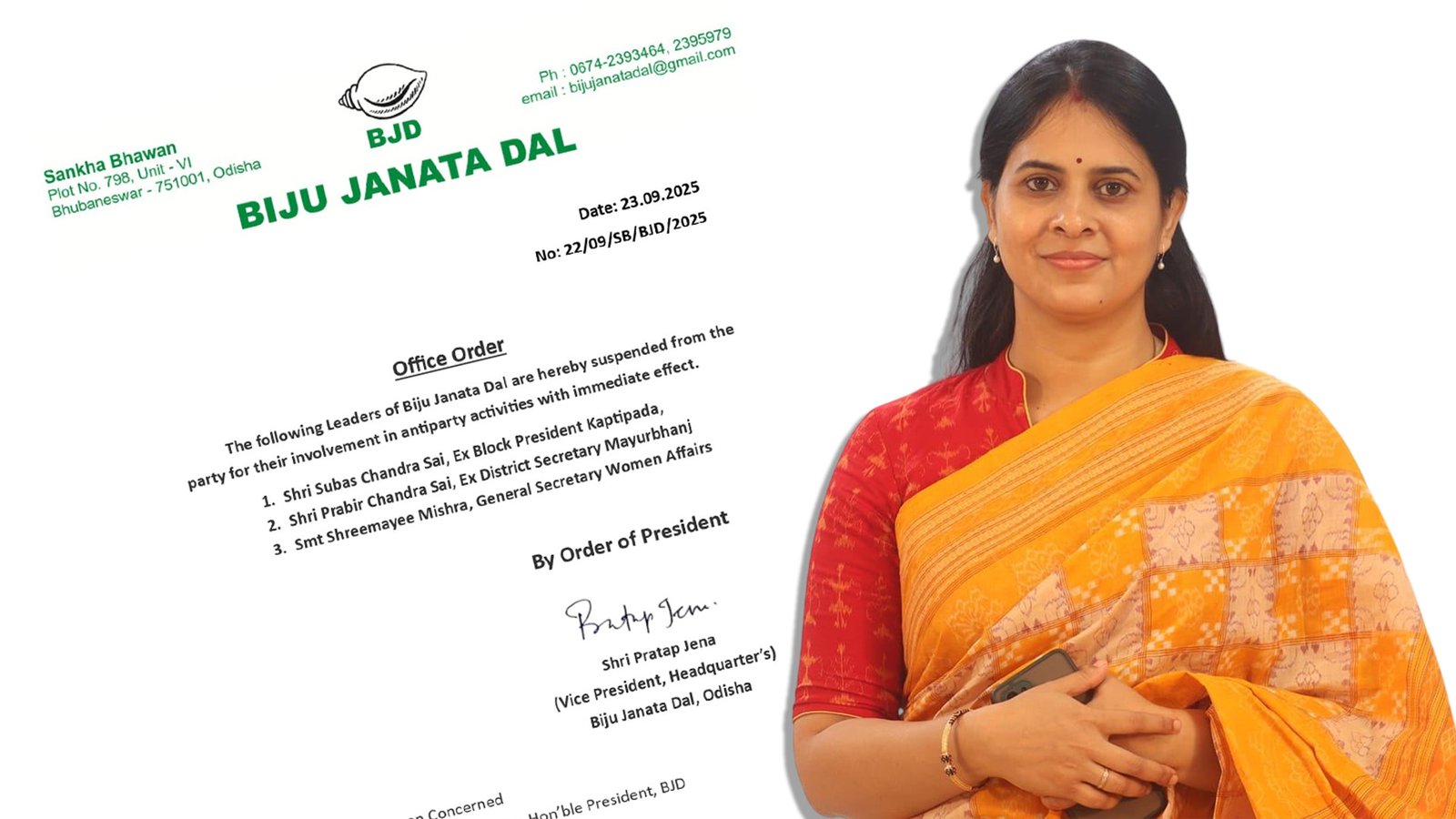 ଶ୍ରୀମୟୀଙ୍କ ବ୍ୟତୀତ କପ୍ତିପଦା ବ୍ଲକର ପୂର୍ବତନ ସଭାପତି ସୁବାସ ଚନ୍ଦ୍ର ସାଇ ଏବଂ ମୟୂରଭଞ୍ଜର ପୂର୍ବତନ ଜିଲା ସମ୍ପାଦକ ପ୍ରବୀର ଚନ୍ଦ୍ର ସାଇଙ୍କୁ ମଧ୍ୟ ବିଜେଡିରୁ ନିଲମ୍ବିତ କରାଯାଇଥିବା ବିବୃତିରେ ସୂଚନା ଦିଆଯାଇଛି।