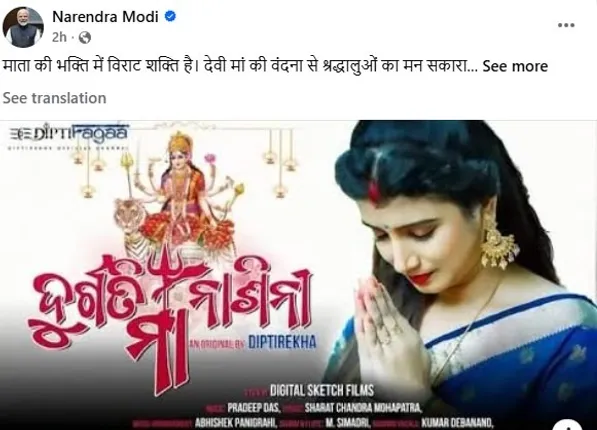 ପ୍ରଧାନମନ୍ତ୍ରୀଙ୍କ ଫେସବୁକ୍ ପୋଷ୍ଟରେ ଓଡ଼ିଆ ଝିଅ । ଚୈତ୍ର ନବରାତ୍ରୀ ଉପଲକ୍ଷେ ପ୍ରଧାନମନ୍ତ୍ରୀ ନରେନ୍ଦ୍ର ମୋଦୀ ‘ଦୁର୍ଗତି ନାଶିନୀ ମା’ର ୟୁଟ୍ୟୁବ୍ ଲିଙ୍କ୍ ସେୟାର କରିଛନ୍ତି। ଯାହାର କଣ୍ଠଶିଳ୍ପ ହେଉଛନ୍ତି ଓଡିଆ କଣ୍ଠ ଶିଳ୍ପୀ ଦୀପ୍ତିରେଖା ପାଢ଼ୀ । ପୋଷ୍ଟ କରିବା ସହ ପ୍ରଧାନମନ୍ତ୍ରୀ ଲେଖିଛନ୍ତି: “ଦେବୀଙ୍କ ପ୍ରତି ଭକ୍ତିରେ ଅପାର ଶକ୍ତି ଅଛି। ଦେବୀଙ୍କ ପୂଜା କରିବା ଦ୍ୱାରା ଭକ୍ତମାନଙ୍କ ମନ ସକାରାତ୍ମକ ଶକ୍ତିରେ ପରିପୂର୍ଣ୍ଣ ହୋଇଯାଏ। ସେପଟେ ଏହାକୁ ନେଇ କଣ୍ଠଶିଳ୍ପୀ ଦୀପ୍ତିରେଖା କହିଛନ୍ତି ମୁଁ କେବେ କଳ୍ପନା କରି ନଥିଲି ଯେ ମୋର ଭକ୍ତି ଗୀତ ଏବଂ ଭିଡିଓ ପ୍ରଧାନମନ୍ତ୍ରୀ ନିଜେ ସେୟାର କରିବେ। ସେ ଆହୁରି ମଧ୍ୟ କହିଛନ୍ତି ଯେ ଏହା ତାଙ୍କୁ ଗଭୀର ଭାବରେ ଅନୁପ୍ରାଣିତ କରିଛି । ତାଙ୍କ ଆଗାମୀ କ୍ୟାରିଅରରେ ଆହୁରି ଭଲ ପ୍ରଦର୍ଶନ କରିବାକୁ ପ୍ରେରଣା ଦେବ।